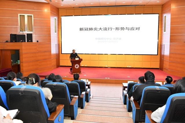 会见后,冯子健研究员在办公楼一楼报告厅做了题为《新冠肺炎大流行—形势与应对》的报告,张建华主持报告会。冯子健从新冠肺炎流行特征、疫情的局部爆发、我国抗疫经验等几个方面进行了深入讲解,并与参会师生进行了深入交流。