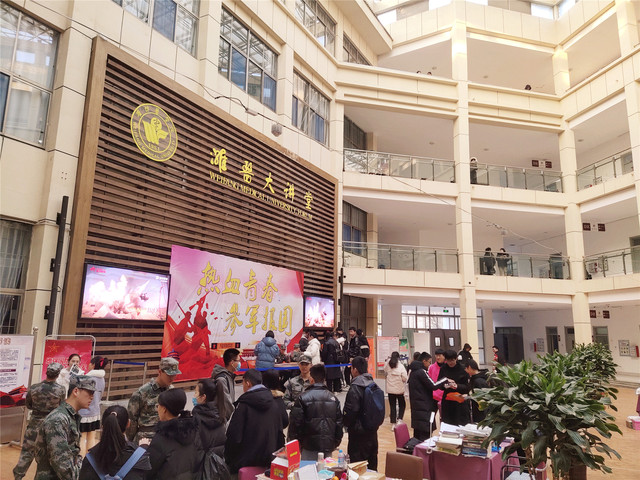 启动仪式现场,征兵主题背景板有序挂置,横幅、宣传架、门型展板摆放整齐,电视屏幕上,征兵宣传片滚动播放,营造了浓厚的征兵宣传氛围。在现场,工作人员发放征兵宣传手册和大学生入伍政策、大学生入伍基本知识等多种宣传材料,与100多名前来咨询的同学互动问答。在智和湖畔、操场、实验楼,我校退役复学学生跟学校新媒体联盟联手拍摄征兵宣传片,学生自编自导自演,展现我校服兵役同学的高强本领和过硬素质。餐厅、学生公寓、操场等学生密集的地方,悬挂横幅,宣传标语贴近学生。校园广播站的同学们访谈我校优秀的退役复学学生、军事爱好者,适时广播大学生征兵政策,宣传入耳走心。在学校所有公寓LED屏上,精心挑选的征兵宣传标语循环播放,征兵信息走到学生“家门口”。上课前,征兵宣传片定时播放,宣传有声有色。在餐厅开饭点,在晚上到宿舍里,大学生征兵宣传员将征兵政策送到学生眼前。在考试月的间隙,系列活动还将见缝插针的进行。