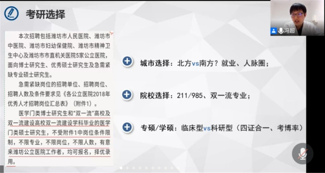 冯超以“勤于当下,放眼未来”为主题,结合本硕学习经验及从医工作经历,从大学生活、考研选择和择业就业三方面展开,分享如何以最好的姿态度过大学五年学习生活。冯超鼓励同学们学好专业知识,提高英语成绩,为后续考研或工作打下坚实基础;激励大家参加社团活动,加强实践锻炼,培养综合素质;勉励大家践行“乐道济世”校训,为个人成才、学校进步和国家发展贡献青春力量。本期讲座干货满满,同学们受益匪浅。