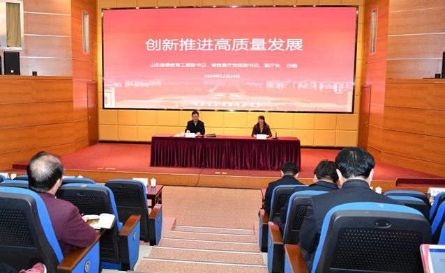 在全国上下深入贯彻落实党的十九届五中全会精神,加快推进高等教育高质量发展之际,山东省委教育工委副书记、省教育厅党组副书记、副厅长白皓来到我校,以《创新推进高质量发展》为题作辅导报告。学校党委书记李明,院长管英俊,党委副书记张潍华,副院长孙宏伟、刘军,纪委书记、监察专员田艳玲,副院长张建华、卢国华出席会议。管英俊主持报告会。