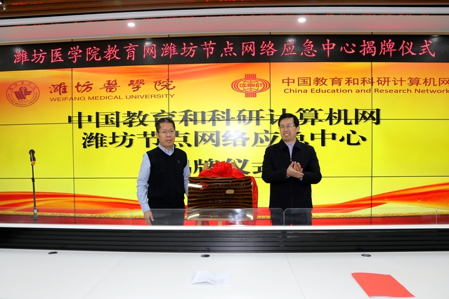 1月8日下午,中国教育和科研计算机网(CERNET)潍坊地区年度工作会议暨教育网潍坊节点网络应急中心揭牌仪式在我校举办。副院长张建华、赛尔网络有限公司山东分公司总经理刘保太出席会议,共同为教育网潍坊节点网络应急中心揭牌。