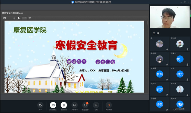 假期期间,学院通过微信公众号、QQ群、微信群等不定期推送安全教育及疫情防控信息,提高同学们安全防范意识;通过《2021年寒假致学生家长的一封信》,和学生家长携手共同做好学生的安全教育管理;与寒假社会实践相结合,通过组织同学们在线学习“寒假十课”,加强学生的思想政治教育,引导学生坚定“四个自信”,听党话,跟党走;组织各班召开了寒假安全主题讨论班会,让同学们撰写寒假安全教育心得体会,使同学们更加深刻地认识到安全的重要性,时刻牢记“安全无小事”;严格落实疫情防控要求,指导学生做好假期居家期间的防护工作,坚持“每日体温上报”制度,确保同学们的身体健康和安全。