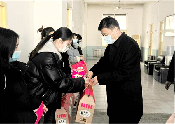春晖渐近旧岁去,一元复始万象新。2月8日农历腊月二十七,校党委书记李明,副院长张建华,党委委员、统战部部长梁淑娟带队看望慰问春节留校学生和坚守岗位的一线教职医务员工,代表学校送去新春祝福。