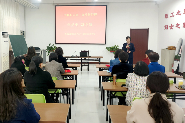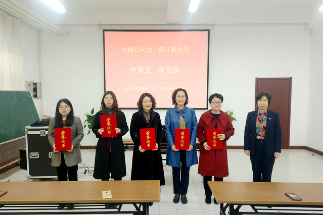 活动表彰了潍坊医学院2020年巾帼建功先进集体、先进个人、最美家庭并颁奖。刘建兰副教授为大家做了“为什么历史选择中国共产党”的党课宣讲。于斌、黄爱文两位同志的“学党史、颂党情”主题朗诵声情并茂,感人至深,表达了潍医女职工对中国共产党的无限深情和“巾帼心向党 奋斗新征程”的豪情壮志。