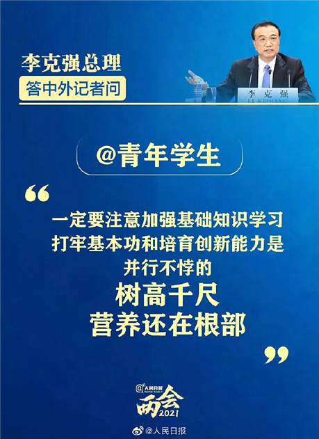 3月11日下午,国务院总理李克强在人民大会堂三楼金色大厅出席记者会并回答中外记者提问。总理叮嘱青年学生打牢基本功,“树高千尺,营养还在根部”让学校师生产生热烈的共鸣。