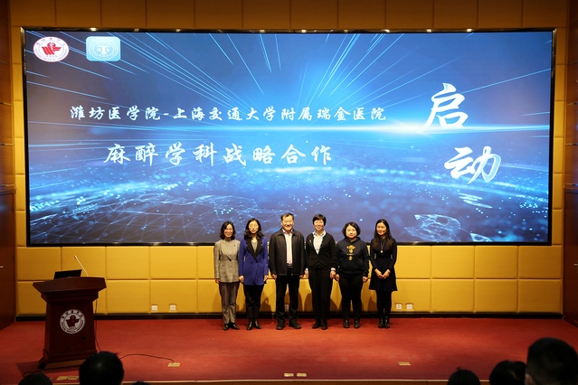 期间,还举行了潍坊医学院 — 上海交通大学医学院附属瑞金医院麻醉学科战略合作启动仪式。双方将以此为契机在教育教学、科学研究、师资团队建设、教材建设等方面建立全方位多元化合作,搭建一流协同育人平台,共同服务“健康中国战略”。瑞金医院一行还参观了临床能力培训中心。