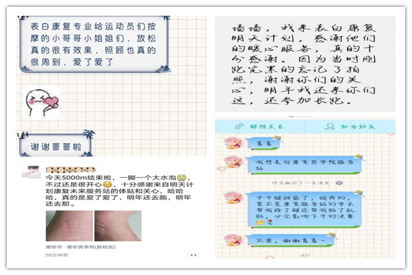 比赛过程中,他们为广大运动员提供肌肉按摩以及牵伸放松,主要是赛前热身包括肌内效贴和热身动作,可以有效激活运动员肌肉群和促进本体感觉,使运动员以最佳身体机能状态获得优异成绩;赛后放松包括肌内效贴、泡沫轴和徒手拉伸,通过放松肌肉、肌筋膜和促进淋巴循环来缓解运动员赛后疲劳。短暂的两天,志愿者们累计服务运动员达300余人次,服务时长达20余小时,他们忙碌的身影在运动场上形成了一道美丽的风景线。本次志愿活动获得学校裁判组及运动员的一致好评,在“潍医表白墙”、微信朋友圈等多种社交平台广为宣传。