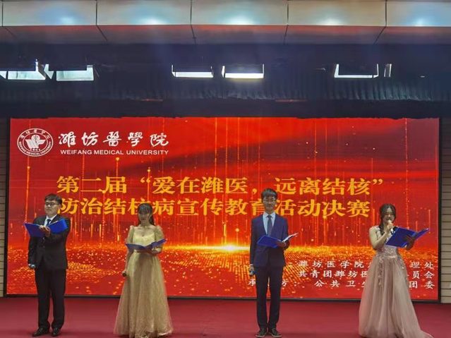 4月21日晚,由校团委、后勤管理处主办,公共卫生学院团委承办的第二届“爱在潍医,远离结核”防治结核病宣传教育活动决赛于图书馆演播厅顺利举行。大赛由我校团委副书记赵建辉、公共卫生学院副院长郑文贵、校医院院长陶恩学、鲁南制药集团人事部招聘经理战祥龙、流行病学教研室李兰花教授、卫生检验与检疫教研室于晓丽老师及各院系辅导员担任评委。