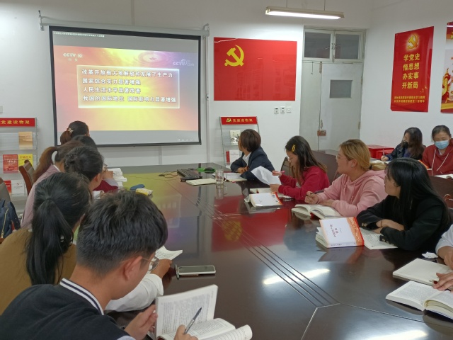 活动中,学生党员们纷纷晒出了自己的《中国共产党简史》读书摘抄笔记,并就学习心得进行了汇报交流;全体党员观看了百家讲坛《党史故事100讲之科教春天 万众欢腾》,深入的学习了解了改革开放时期的历史;党支部书记就近段时间的党史学习教育进行总结,并就下一步的学习进行了安排署。