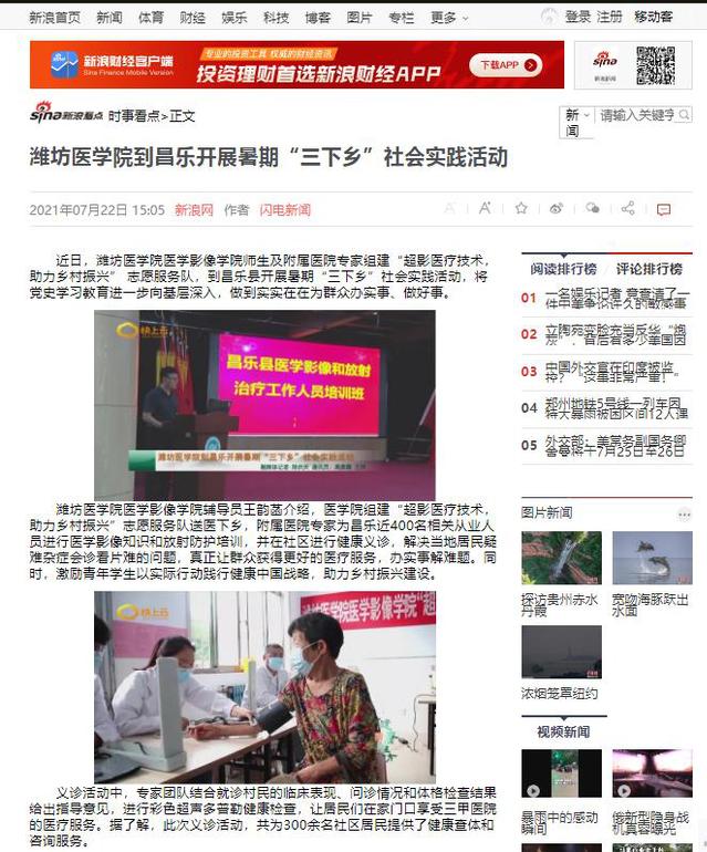 为贯彻落实习近平总书记提出的振兴乡村的号召,将党史学习教育进一步推向深入,做到实实在在为群众办实事、做好事,近日,医学影像学院师生及附属医院专家组建“超影医疗技术,助力乡村振兴”志愿服务队,赴昌乐县开展暑期“三下乡”社会实践活动。本次活动目前已被齐鲁网、闪电新闻、新浪网、网易新闻、潍坊电视台、昌乐传媒网等多家新闻媒体报道。