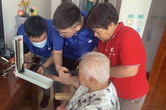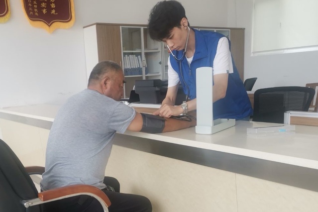 公益测量血压,普及医疗知识。志愿者在村委会驻地为村民进行血压测量,讲解血压测量的方法,普及高血压和低血压的相关知识,并为村民提供合理化建议。