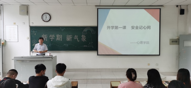 为了解学生返校后思想动态,落实疫情防控要求,增强学生的安全意识,心理学院组织开展了“开学第一课”主题教育活动,党总支书记刘宪亮、副书记朱红、辅导员及各班级同学参加活动。