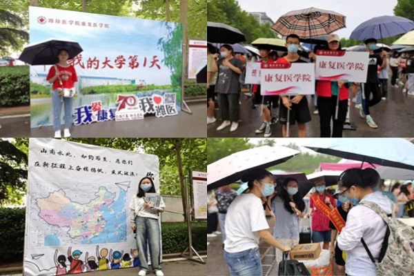 学院推出“一对一”的暖心服务,每位老生对接一名新生,志愿者们分工明确,接站、引导、搬运行李、答疑、资料审核一条龙,到处都是忙碌的身影,师生们热情周到的服务很快消除了新生们初来乍到的陌生感,让他们感受到家一般的温暖。迎新现场,为了让新生了解专业特点和学团生活,学院精心制作了宣传板;为了缓解新生的思乡之情,绘制了“你来自哪里”的中国地图签名版,以便找到更多的老乡;设计了“梦想启航”信箱,让萌新们尽早确定理想目标,做好大学四年的人生规划;制作了“我爱潍医”、“我爱康复”和“70周年校庆标志”等手持牌,以及带着学校和老师们衷心祝福的朋友圈拍照板,伴随着相机咔嚓声响,留下一张张充满期待和希望的笑脸,也表达了大家对建校七十周年的纪念和祝福!