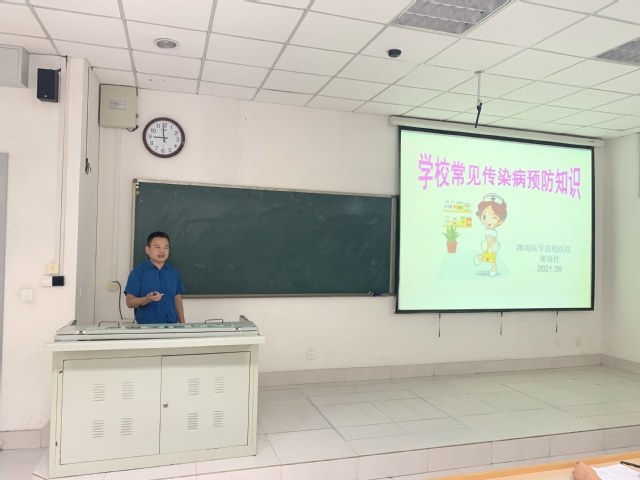 2021年9月26日上午,管理学院管理与法学专业2021级新生,开展传染病防控知识专题讲座。本次讲座由校医院院长谢瑞柱主讲,管理学院党委副书记孙勇和辅导员参加。