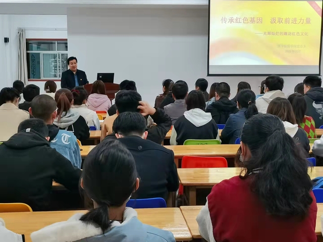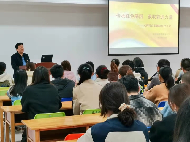 潘庆忠从“为什么要学习党史”、“学习党史的时代意义”、“如何学习党史”入手,带领同学们重温了习近平总书记在第十九届中央政治局第三十一次集体学习讲话中提出的学习党史赓续红色血脉重点把握的“五个始终坚持”和用心用情用力做好红色资源的“三个好”,他强调,红色资源是我们党艰辛而辉煌奋斗历程的见证,是最宝贵的精神财富,大家要牢记初心使命、传承红色基因,领悟革命精神,做肩负起新时代红色血脉的传承者。随后,潘庆忠围绕红色文化及其价值内涵、潍坊地域红色文化资源、红色文化资源的开发利用和加强红色文化教育四方面进行讲述,从潍县战役到渤海走廊革命斗争,从潍县党组织革命先烈庄龙甲到 “杰出女革命家”陈少敏,潘庆忠生动地讲述了潍坊革命先烈们一个个可歌可泣的光辉事迹,带领大家回顾潍坊革命征程的重要历史轨迹和脉络,展示了中国革命历史上为国捐躯、舍身为国的革命先烈精神。