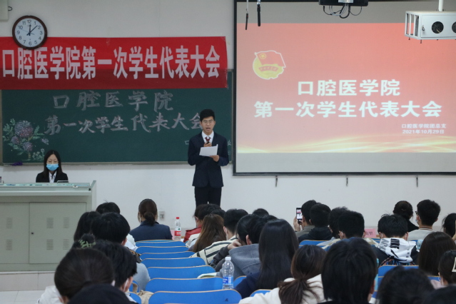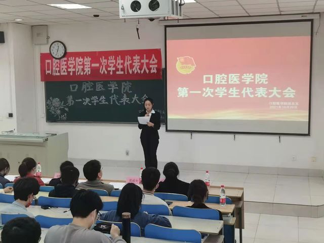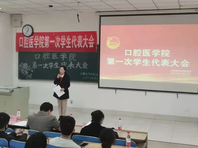 10月29日,口腔医学院第一次学生代表大会在教学楼A411教室隆召开。学院党总支书记张立、副书记姜晓宁,全体辅导员老师以及111名学生代表参加了会议。