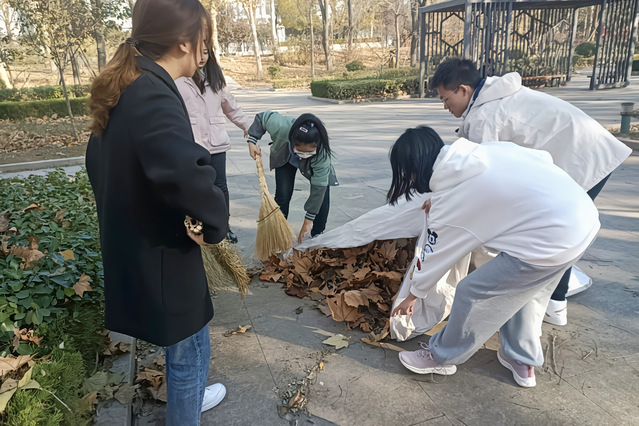 活动中,志愿者首先向大家介绍了清扫落叶的注意事项,将同学们分为四个小组,携带扫帚、落叶袋等工具,在树叶密集、落叶集中的区域进行作业,有序地开展扫落叶活动。清扫完毕,志愿者将落叶集中装到环卫工人的密闭垃圾车中,保证落叶不积存、不滞留、运输不飞散。