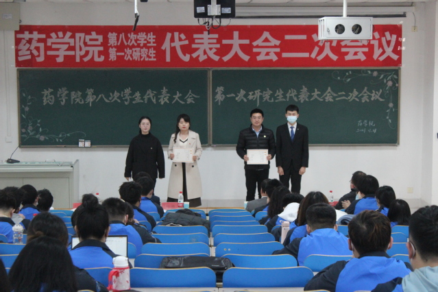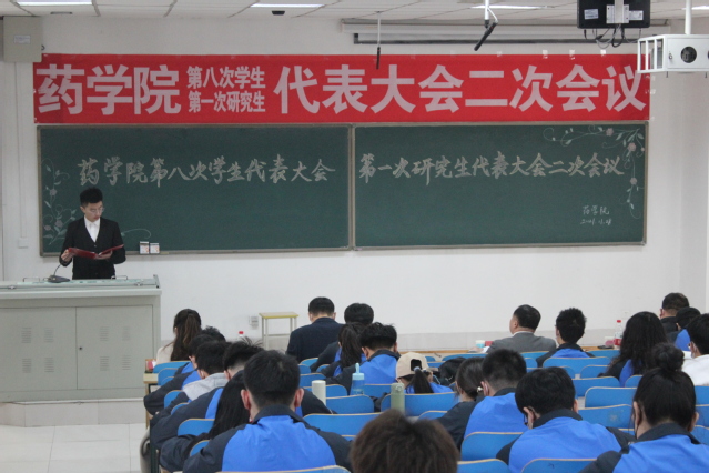 本次会议以深化学院学风建设、规范学生会组织管理为主题,听取了《学生会工作报告》和《研究生会工作报告》,选举产生了学校第九次学生代表大会代表、第四次研究生代表大会代表,审议并通过了调整充实后的《药学院第十五届学生会成员建议名单》《药学院第一届研究生会成员建议名单》,制定了《药学院班级公约》《药学院宿舍公约》。为加强对学院学生会和研究生会工作指导,大会聘任杨雪老师为学生会秘书长、马广斌老师为研究生会秘书长。团总支副书记杨雪发言,希望全院青年学生团结协作,深入推进班团一体化建设、团小组宿舍一体化建设,持续为学校发展和学院建设添砖加瓦。