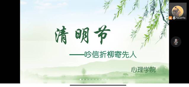 4月5日,在清明节之际,为引导学生缅怀先烈、先贤,弘扬优良传统和爱国主义精神,心理学院举办“吟信折柳寄先人”活动,2021级全体学生参加。