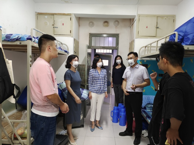 “同学们好,大家吃饭了吗?学校的饭菜可口吗?”“你家是哪里的?”“宿舍住的还习惯吗?”在走访过程中,院领导对同学们亲切地问道。同时和新生进行了深入交谈,关切地询问了新生的家乡、进校情况、住宿情况、食堂就餐情况等,并耐心详尽地解答新生提出的各种问题,鼓励他们尽快适应新环境,熟悉新同学,融入班级与学院大家庭,同时表示了学院对新生的热烈欢迎及亲切关怀。鼓励同学们要以积极的心态站在新的起点,刻苦学习专业知识,在未来有所发展、有所作为。