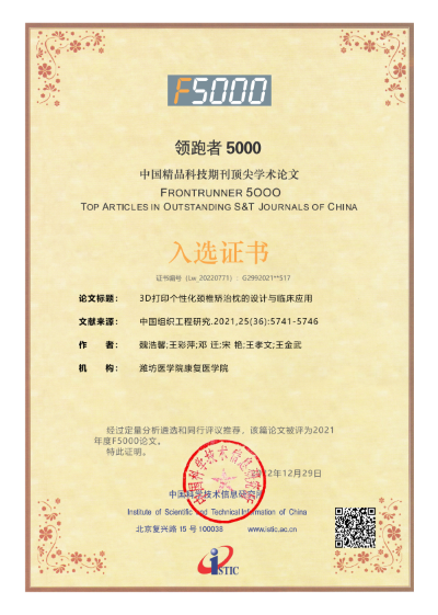 近日,2021年度“领跑者-中国精品科技期刊顶尖学术论文(F5000)遴选结果公布,我校康复医学院2018级研究生魏浩馨为第一作者,王孝文教授和王金武教授为通讯作者的论文“3D打印个性化颈椎矫治枕的设计与临床应用”成功入选。