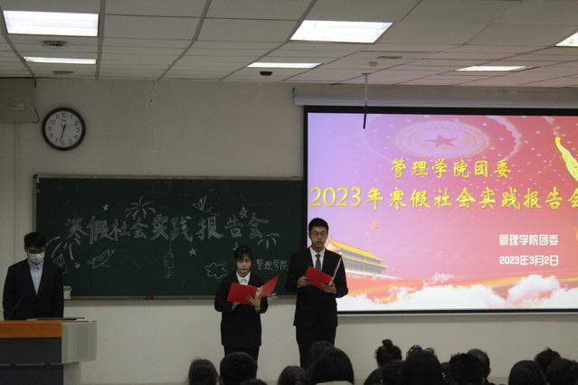 孙勇指出,参加社会实践的同学通过自己的行动宣传了学校,展现了管理学院学子的精神风貌,值得大家学习,希望同学们行动起来,营造一种人人参与志愿服务的氛围,让同学们在火热的社会实践中历练意志、提升能力。孙勇希望同学们认真总结,提升水平,注重实效,修身有为,科学做好学业规划,设计好职业发展路线图,不断提高自身素质,争当新时代有为之人。会上,参加青鸟计划寒假“返家乡”等社会实践活动的学生代表依次进行了汇报,分享了实践过程和心得体会。同学们一致认为,通过这些实践活动,体会到了基层工作的不易、自身能力的不足、以及服务社会增长阅历的喜悦。本次报告会评选出实践标兵奖两名、先进个人奖三名、优秀志愿者奖三名。