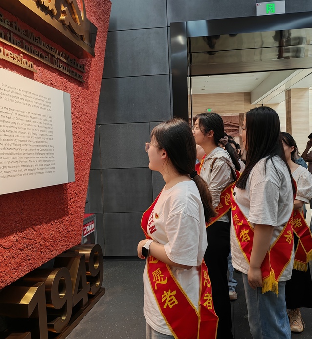 追溯奋斗足迹,筑牢信仰之基。进入展馆内,大家参观“革命”“建设”“改革”“复兴”四个篇章及纪念中国人民抗日战争暨世界反法西斯战争胜利80周年图片展,瞻仰革命先烈们英勇斗争的光辉事迹。馆内设置多媒体互动场景,大家借助3D视频等形式与历史人物互动,深入了解潍坊市党史发展脉络。