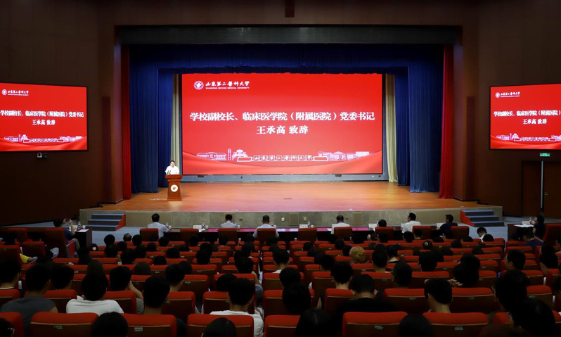 王承高对2025级新生的到来表示欢迎,祝贺新生成为学校高质量发展新征程的见证者和参与者。他介绍了学校办学层次的跨越式发展及学院人才培养质量的丰硕成果,并向新生提出希望:一要坚定理想信念,做志存高远的追梦人;二要练就过硬本领,做勤学笃行的实干家;三要锤炼高尚品格,做仁心仁术的践行者。他勉励新生以2025年“最美医生”、齐鲁时代楷模、优秀校友张军桥为榜样,做“沉得下、用得上、干得好”的人民健康守护者。