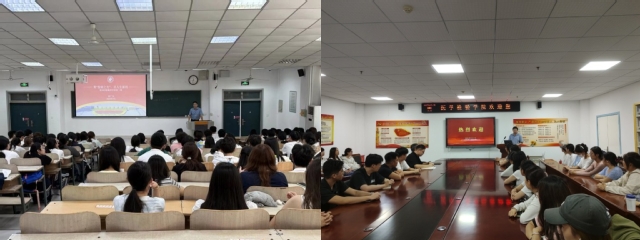近日,医学检验学院举行2025级本科生、研究生新生开学第一课,党总支书记姜广东、院长伊正君、副院长李猛、辅导员分别参加活动。