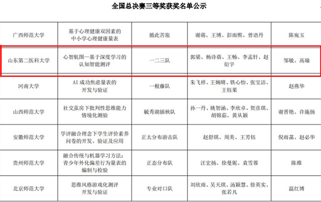 近日,首届“厚粲杯”全国大学生心理与认知智能测评挑战赛在北京师范大学圆满落幕。心理学院应用心理专业参赛队伍“一二三队”(队员:郭梁、杨诗蓓、王畅、李孟轩、赵衍宇)荣获全国三等奖,指导教师邹敏、高瑜获“优秀指导教师奖”。