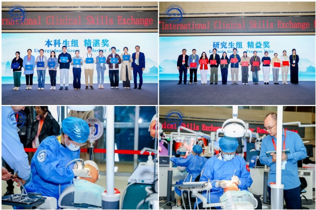 本届“丝路杯”赛事汇聚了中国、日本、西班牙、奥地利等4国37所知名口腔医学院校的150余名师生同台竞技。比赛采用“人机结合”的评分模式,全面考察学生的临床实践能力与创新素养。本科组重点考核基础技能操作,研究生组则更加侧重综合思辨与创新应用能力。比赛中,陈景昊同学在全瓷冠牙体预备、口内切开缝合等项目中操作规范、精准到位;刘梦竹同学在显微根管治疗、临床思辨等环节中沉着应对,展现出全面的专业素养,赢得了评委的一致好评。