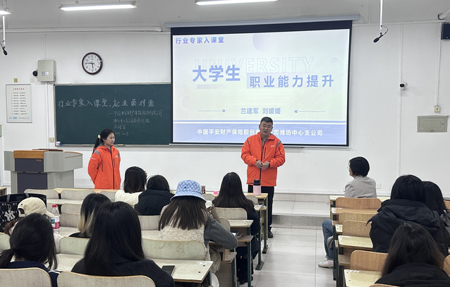 10月23日,管理学院举行“行业专家入课堂 就业面对面”活动,医疗保障系主任胡善菊与专业教师主持活动,中国平安财产保险股份有限公司潍坊中心支公司副总经理兰建军、入职毕业生代表刘媛媛同学参加活动。