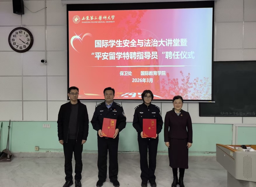 为进一步增强国际学生法治意识与安全防范能力,推进警校协同育人,共筑校园安全防线,3月31日,国际教育学院举办“警校携手 护航安全”国际学生法治与安全教育大讲堂暨“平安留学特聘指导员”聘任仪式。活动邀请潍坊市公安局奎文分局的广文派出所警官郭辉启、奎文分局治安大队警官孙彤作专题讲座。奎文分局治安大队副大队长逯晓、广文派出所副所长刘佳,我校保卫处处长吴周强,国际教育学院院长李向云、副院长仉国琛,以及虞河校区全体国际学生和辅导员参加活动。